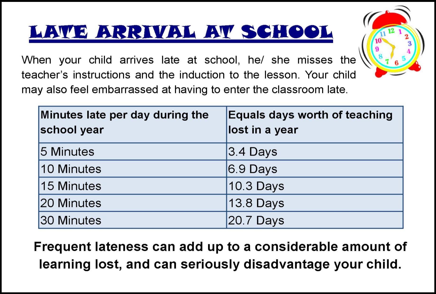 Children who are regularly late or absent from school can find it hard to keep up with their work and may struggle to build friendships, so it is important that they come to school every day and on time.